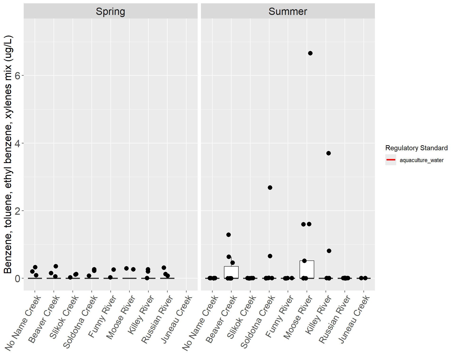 Benzene, toluene, ethylbenzene, m,p-xylene, and o-xylene are the aromatic hydrocarbons that are commonly referred to as BTEX. Volcanoes and forest fires are natural sources of benzene, and benzene is also a component in cigarette smoke, crude oil, and gasoline (ATSDR, 2005a). Benzene breaks down slowly in water and soil, but concentrations do not build up in plants and animals (ATSDR, 2005a). A natural part of crude oil, toluene is used to produce gasoline, paint, paint thinner, lacquer, and adhesives (ATSDR, 2001). Toluene can enter surface water due to petroleum or solvent spills and engine exhaust, but does not buildup to high concentrations in animals (ATSDR, 2001). Ethylbenzene is a colorless liquid found naturally in coal tar and petroleum, and is often used as a solvent and as a component in fuel, ink, insecticide, and paint (ATSDR, 1999). Xylene has three forms or isomers called meta-xylene, para-xylene, and ortho-xylene, which are reported in this study as m,p-xylene and o-xylene. As a natural part of petroleum and coal tar, xylene has many uses as a solvent, cleaner, paint thinner, and a small component of gasoline (ATSDR, 2005b). Once xylene enters surface water, it evaporates quickly into the air, but a small amount can concentrate in aquatic life (ATSDR, 2005b). The ADEC standard is 10 µg/L for total aromatic hydrocarbons in freshwater for the growth and propagation of fish, shellfish, other aquatic life, and wildlife (see Appendix 2) (ADEC, 2012). Additionally, the ADEC requires that surface waters do not have any floating oil, film, sheen, or discoloration due to hydrocarbons and that in shoreline or bottom sediments, there cannot be any concentration of petroleum hydrocarbons that cause deleterious effects to aquatic life (ADEC, 2012).