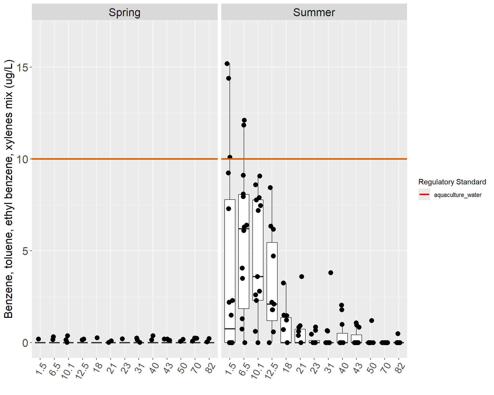 The highest level of BTEX in the mainstem occurred at Mile 1.5 at a level of 15.2 µg/L in summer 2002, and the lowest levels were reported as non-detect because they were below the MDLs and MRLs. No BTEX was reported in any of the spring samples, but high levels were detected in the lower river during the summer (Table 25). No median of BTEX exceeded the Alaska standard, but individual samples from Mile 1.5 and 6.5 exceeded the standard during the summer of 2000, 2001, 2002 and 2003. A clear upward trend is evident from Mile 23 to Mile 1.5, and Mile 40 and Mile 43 show BTEX medians above the next two downstream sites. No BTEX was ever detected at Mile 70 (Figures 114 &115).