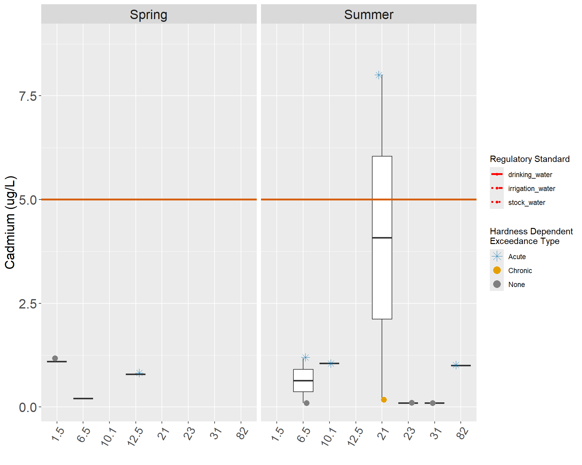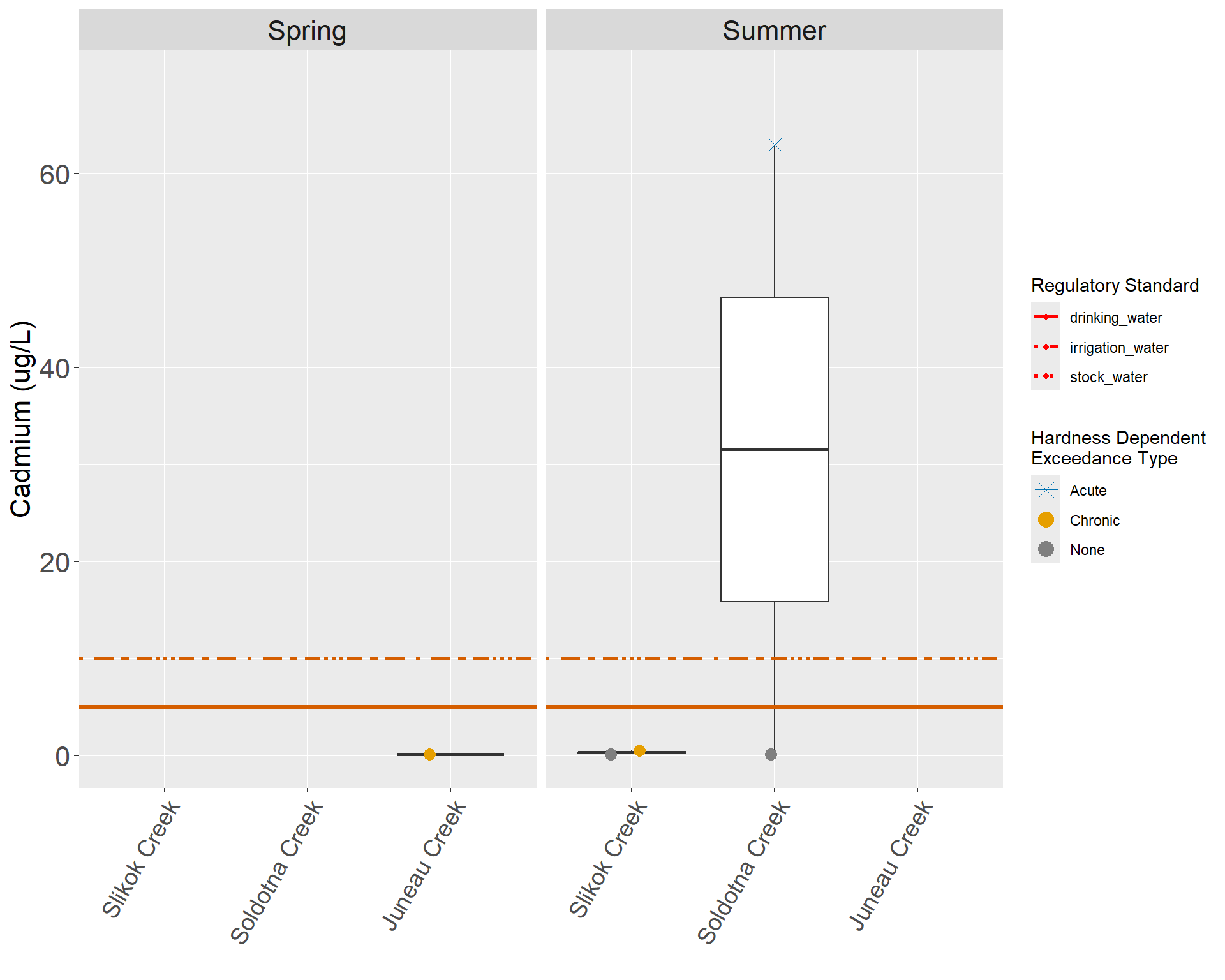 Cadmium is a rare elemental metal that can occur naturally in freshwater at concentrations of less than 0.1 μg/L, but at slightly increased concentrations, it can be toxic to aquatic life (USEPA, 2001). Additional cadmium can enter the hydrologic cycle as a component of fertilizer, pesticide, pigment, and as a result of iron and steel production, coal combustion, and mining waste (USEPA, 2001). The ADEC and the USEPA have set the standard for cadmium at a range of 0.0650 μg/L to 0.64 μg/L, depending on hardness, for chronically exposed freshwater aquatic life (Appendix 2) (USEPA, 2014; ADEC, 2008).