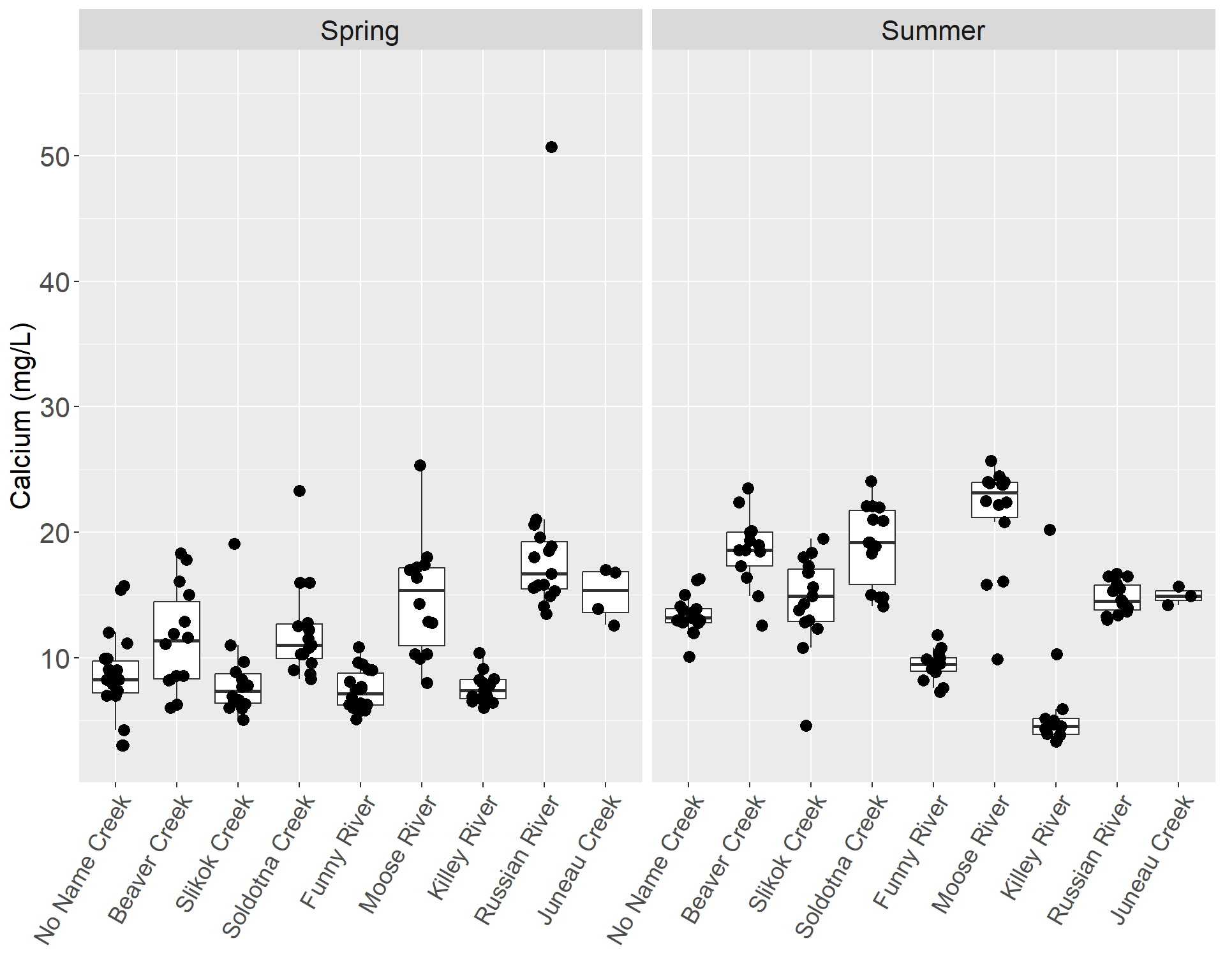 In the tributaries, the lowest concentration was 3 mg/L sampled from the No Name Creek during May 2013, and the highest concentration occurred in the Moose River at 25.7 mg/L during summer 2004 (Table 38). In the spring, the Russian River, Moose River and Juneau Creek had relatively high medians, and Slikok Creek had a relatively low median (Figure 90). In the summer, the Moose River, Soldotna Creek and Beaver Creek had relatively high medians, and the Killey River had a relatively low median (Figure 91). In the spring, most of the tributaries had concentrations lower than the mainstem, but during the summer, most of the tributaries had higher levels of calcium than the mainstem. The tributaries had higher levels of calcium in the summer than in the spring, excluding Russian River, the Killey River and Juneau Creek. Beaver Creek exhibited the largest seasonal difference in medians, changing from 9.25 mg/L in the spring to 18.6 mg/L in the summer (Figures 90 & 91).
