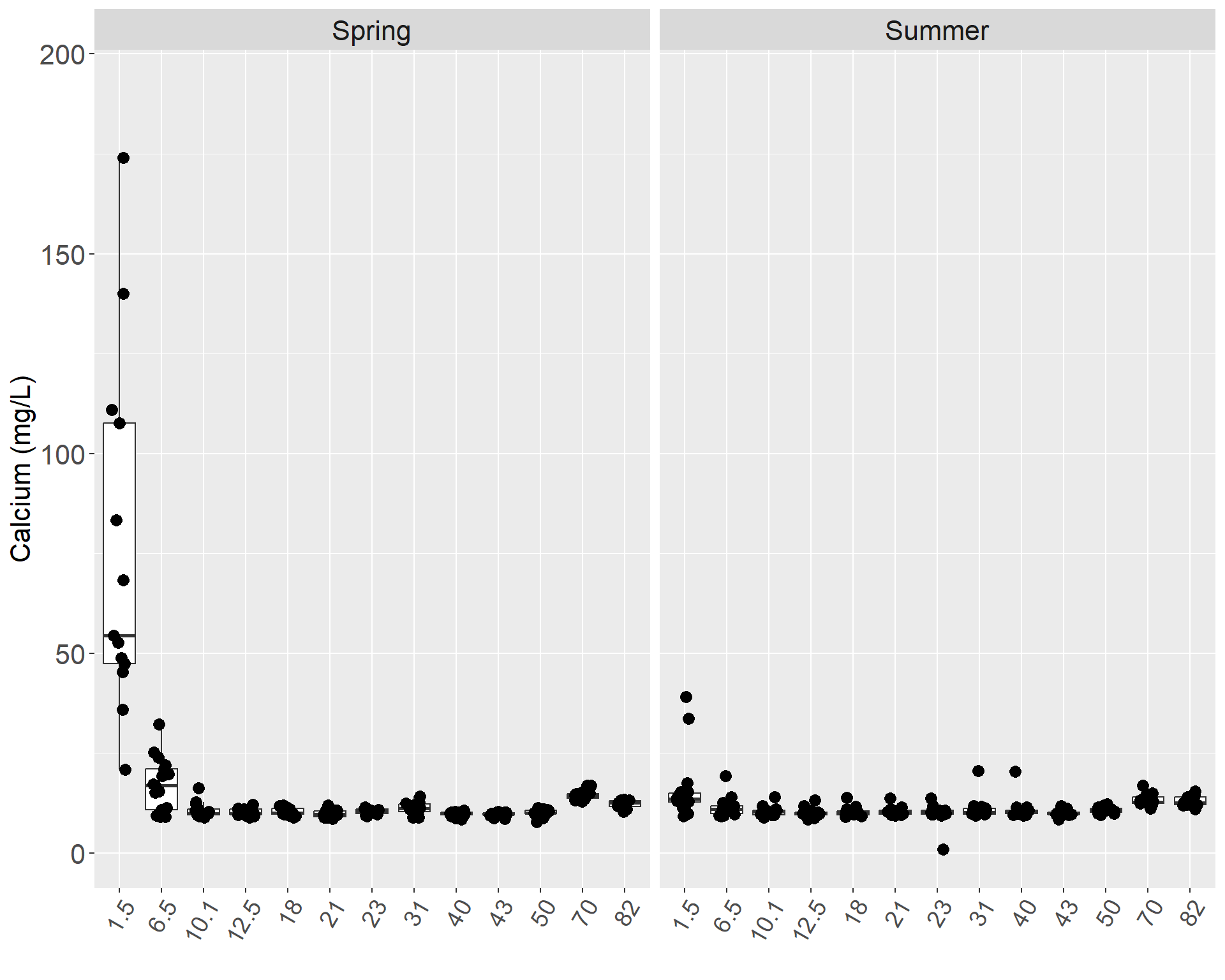 The highest value in the mainstem occurred during spring 2002 at Mile 1.5 with a concentration of 174 mg/L, and the lowest value was 0.447 mg/L at Mile 43 in summer 2010 (Table 12). Relatively high medians in the spring and the summer occurred at Mile 1.5, Mile 6.5, Mile 70, and Mile 82. In the spring and in the summer, the low median at Mile 43 may be linked to the low calcium concentration in the Killey River. Russian River had high levels of calcium and could be the cause of elevated concentrations at Mile 70. In the mainstem, calcium levels were relatively higher in spring than in summer (Figures 88 & 89).
