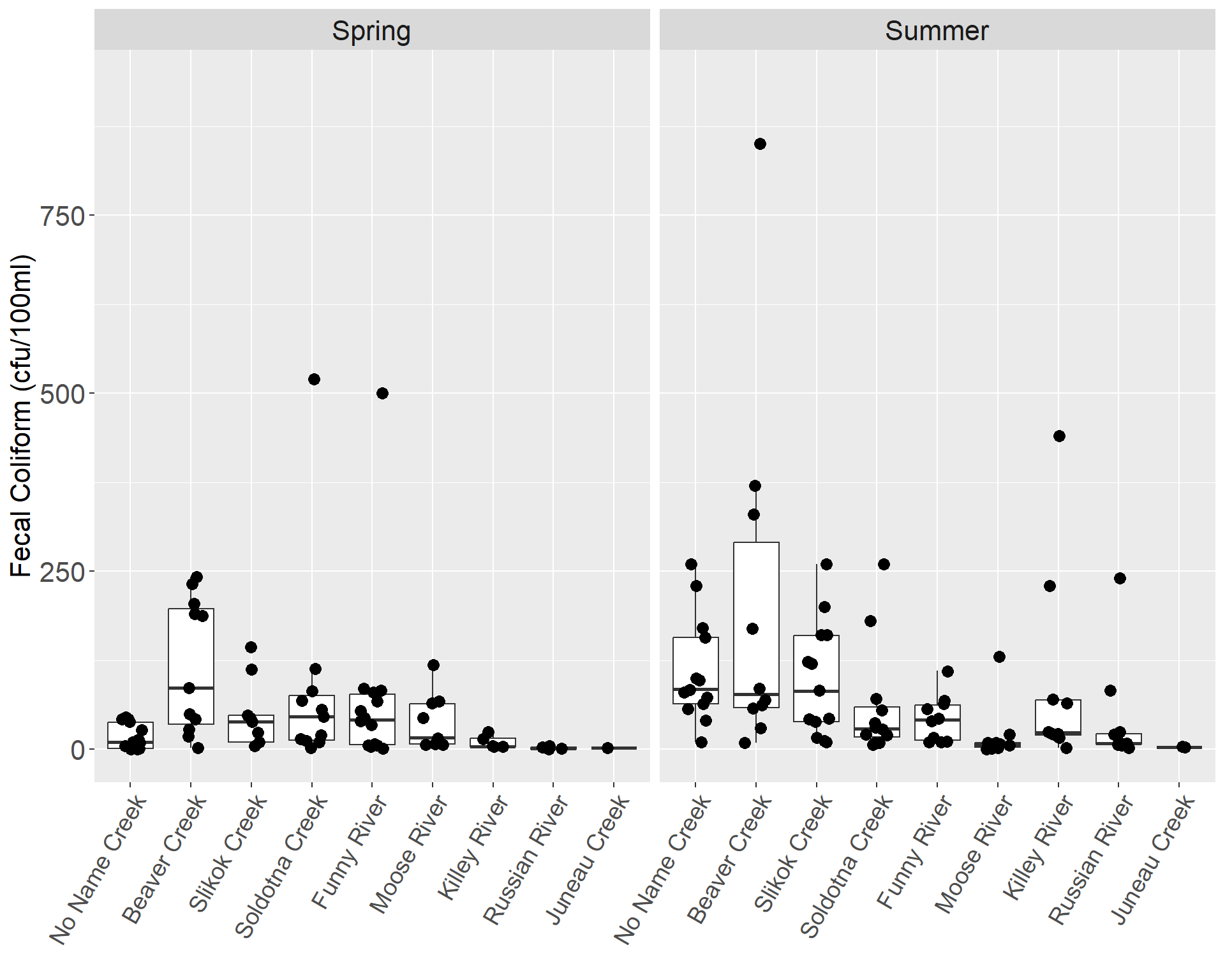 In the tributaries, the concentration of fecal coliform ranged from a high of 520 CFU/100ml in Soldotna Creek during spring 2001 to 0 CFU/100ml at multiple sites (Table 52). During the spring, Beaver Creek had the highest median, and during the summer, No Name Creek had the highest median. In the summer, the median concentrations were relatively high in Slikok Creek and Beaver Creek, in addition to No Name Creek. Juneau Creek, Russian River, Killey River, and Moose River all had relatively low medians during the spring and the summer. In the summer, the tributaries had higher median concentrations of fecal coliform than the mainstem, but in the spring, the levels in the tributaries and the mainstem were more similar. (Figures X - X)