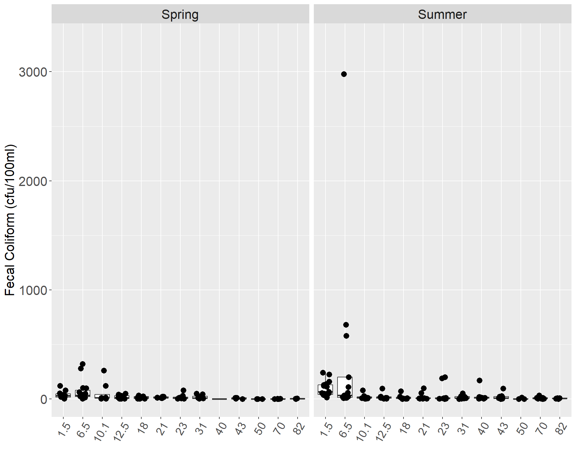 The highest level of fecal coliform recorded was 2980 CFU/100ml at Mile 6.5 during the summer 2002, however this sample may be unreliable because the duplicate sample was below the MDL of 1 CFU/100ml. The next highest recorded concentration in the mainstem was 580 CFU/100ml at Mile 6.5 during the summer of 2003, and the lowest levels were 0 CFU/100ml at several locations (Table 26). The highest median in the mainstem occurred at Mile 6.5 in the spring and at Mile 1.5 in the summer. The other medians along the mainstem were all below 10 CFU/100ml for the summer and the spring. The concentration of fecal coliform was generally higher in the summer than in the spring in the mainstem and the tributaries (Figures X - X).