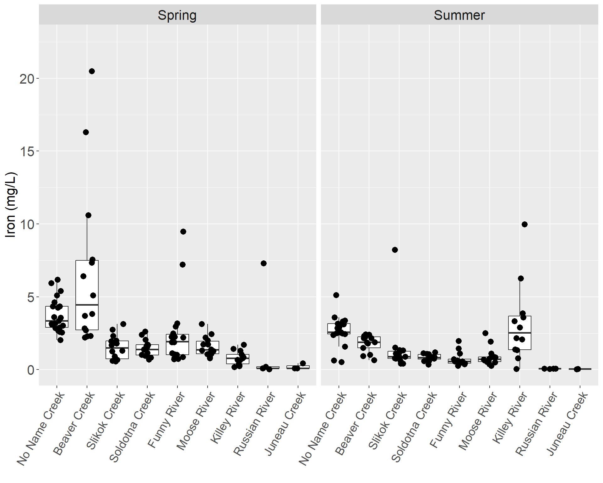 The concentrations in the tributaries ranged from a high of 20.5 mg/L in Beaver Creek in spring 2006 to Russian River, which had the lowest concentration at below the MDL of 0.0027 mg/L (Table X). No Name Creek, Beaver Creek, Slikok Creek, Soldotna Creek, Funny River and Moose River all had medians exceeding the standard in Spring (Figure 94). No Name Creek and Beaver Creek had medians exceeding the standards during summer (Figure X). Russian River had the lowest iron levels with most of the samples reported below the MDL or MRL. In both the tributaries and the mainstem, iron levels were higher in the spring than in the summer (Figures X-X).