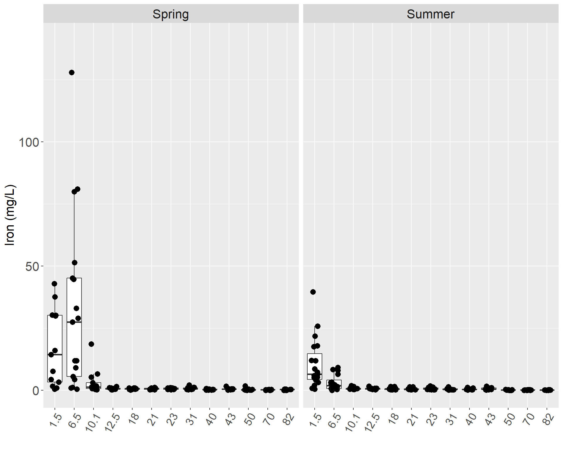 In the mainstem, the highest concentration of iron was 128 mg/L, which occurred at Mile 6.5 during spring 2006, and 0.03 mg/L was the lowest concentration that occurred at Mile 70 during spring 2013 (Table X). Mile 1.5 and Mile 6.5 had the highest medians during the spring and the summer (Figures X & X). Mile 1.5 and Mile 6.5 both exceeded the standard in the majority of samples (Table 13). In the spring, the median at Mile 10.1 also exceeded the standard, but the medians from all other mainstem locations were below the standard in both the spring and the summer (Figures X & X). There was a general upward trend in iron concentration from Kenai Lake to the estuary, especially in the summer.