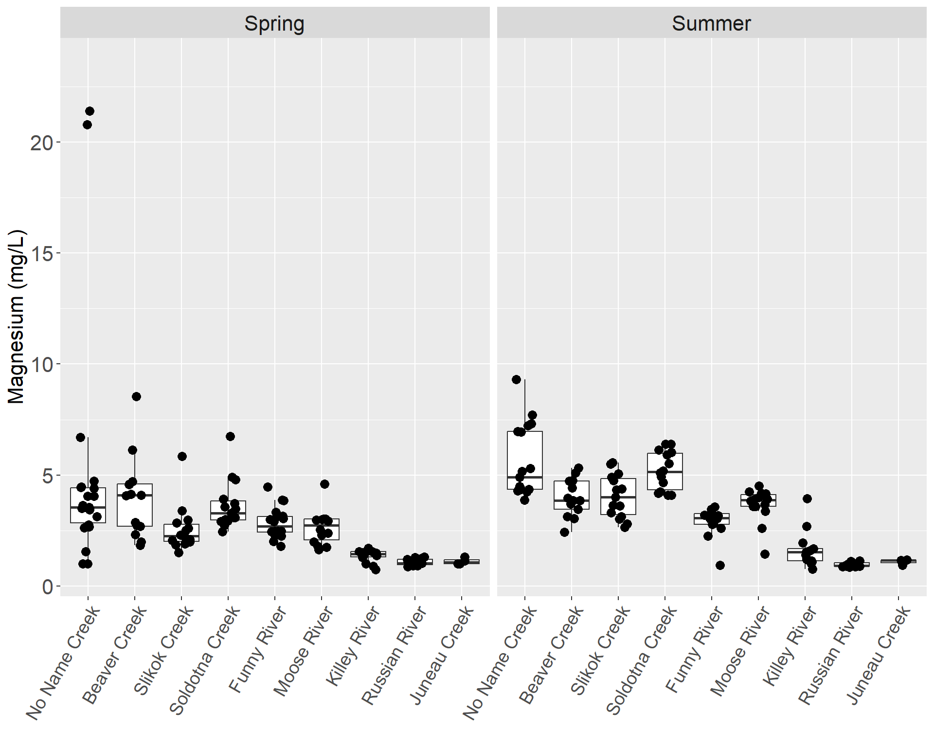 The concentrations in the tributaries ranged from the high of 21.4 mg/L in spring 2010 at No Name Creek to 0.746 mg/L in spring 2004 at the Killey River (Table X). The Killey River, Russian River and Juneau Creek had low medians in comparison to the other tributaries like Soldotna Creek, which had the highest median during the summer. Excluding the estuary, the tributaries generally had higher levels of magnesium than the mainstem. In the tributaries, median concentrations were higher in the summer than in the spring, excluding Beaver Creek and Russian River (Figures X & X).