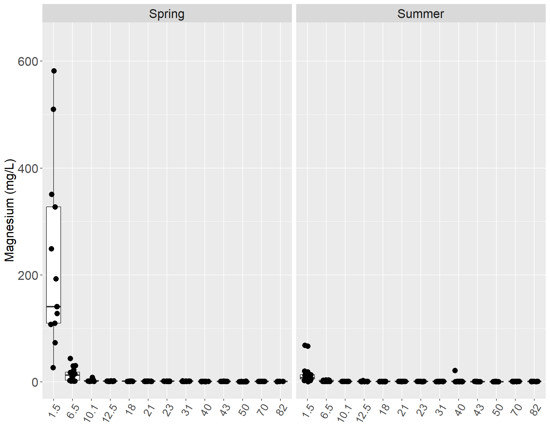 In the mainstem, the highest concentration of magnesium was 582 mg/L and occurred at Mile 1.5 during spring 2011, while the lowest level was 0.729 mg/L at Mile 50 in summer 2001 (Table X). In both the spring and the summer, Mile 1.5 had the highest median followed by Mile 6.5. There was a general upward trend in magnesium levels from Kenai Lake to the estuary in both the spring and the summer. Magnesium levels were higher upstream of Skilak Lake, and at the outlet, magnesium dropped to the lowest levels recorded in the watershed. In the mainstem, magnesium concentrations were higher in the spring than in the summer (Figures X & X).