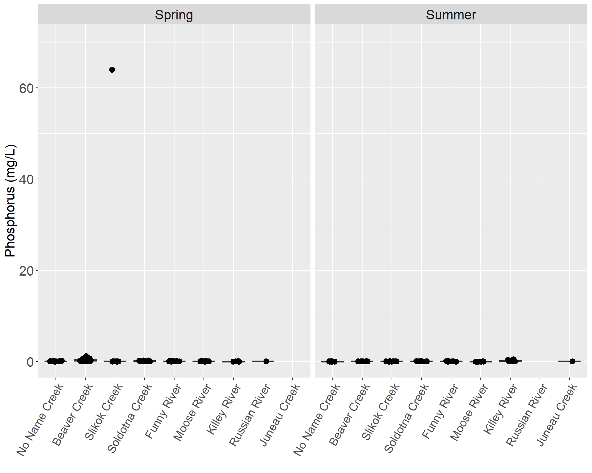In the tributaries, phosphorus ranged from 64 mg/L in Slikok Creek during May 2013 to below the MDL of 0.0020 mg/L at many locations in the spring and the summer (Table X) Beaver Creek had the highest median in the spring but dropped to the second highest in the summer, after the Killey River. Funny River had relatively high medians during both the spring and the summer. In contrast, Russian River displayed the lowest median in both the spring and the summer (Figures X & X).