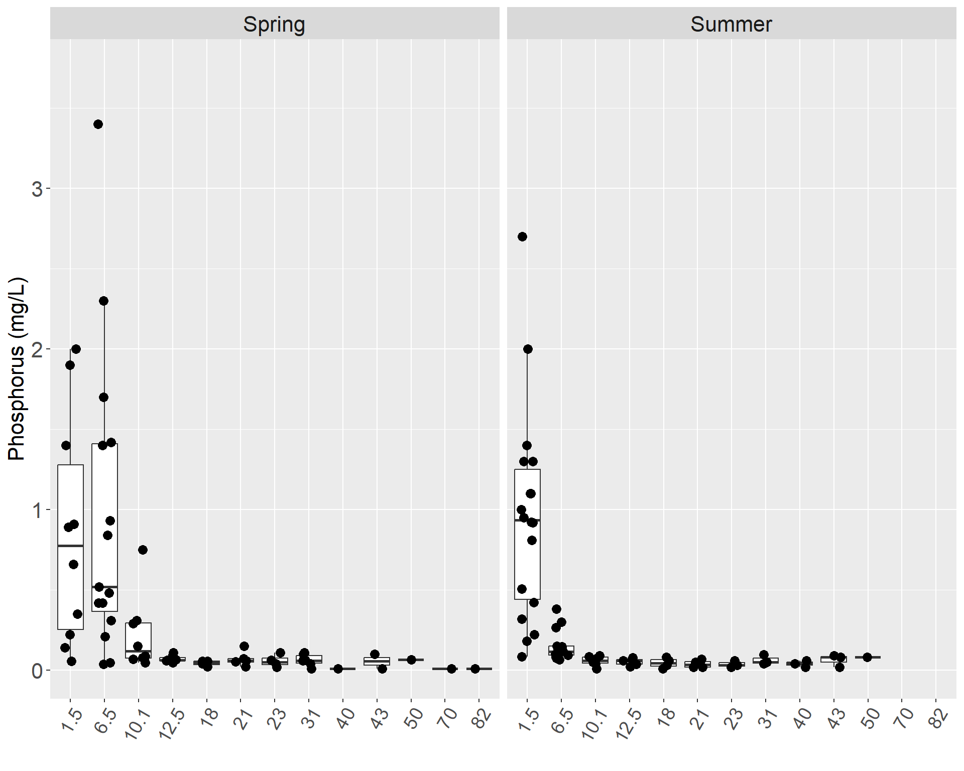 The highest level of phosphorus ever recorded occurred at Mile 1.5 in spring 2005 with a concentration of 4 mg/L, and the lowest levels occurred on many occasions below the MDL of 0.0020 mg/L in the spring and the summer (Table X). The estuary had significantly higher medians and variance than the rest of the mainstem in the summer and the spring. The lowest concentrations of phosphorus occurred between Mile 40 and Mile 82. In the mainstem, there was a general upward trend in phosphorus concentration from Kenai Lake to the estuary (Figures X & X).