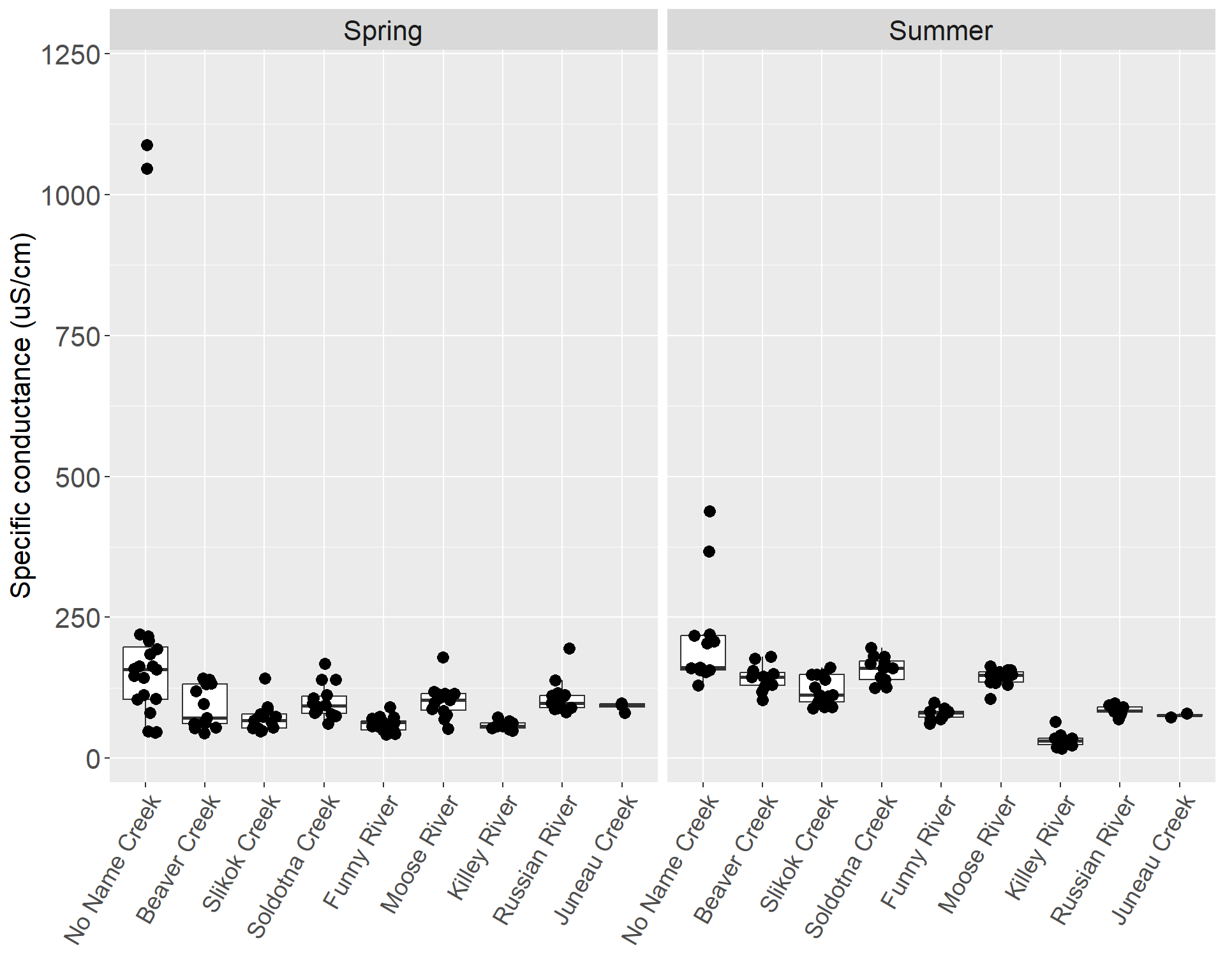 In the tributaries, specific conductance ranged from a high of 1088 µS/cm in No Name Creek during spring 2010 to the lowest level of 18 µS/cm in the Killey River during summer 2004 (Table X). The Killey River maintained the lowest median during the spring and the summer, while the highest median was in No Name Creek for both the spring and Soldotna Creek for the summer. The tributaries had higher levels of specific conductance in the summert, except for the Killey River, Russian River and Juneau Creek. In the summer, the tributaries generally had higher medians than the mainstem, but a corresponding trend was not apparent in the spring data (Figures X & X).