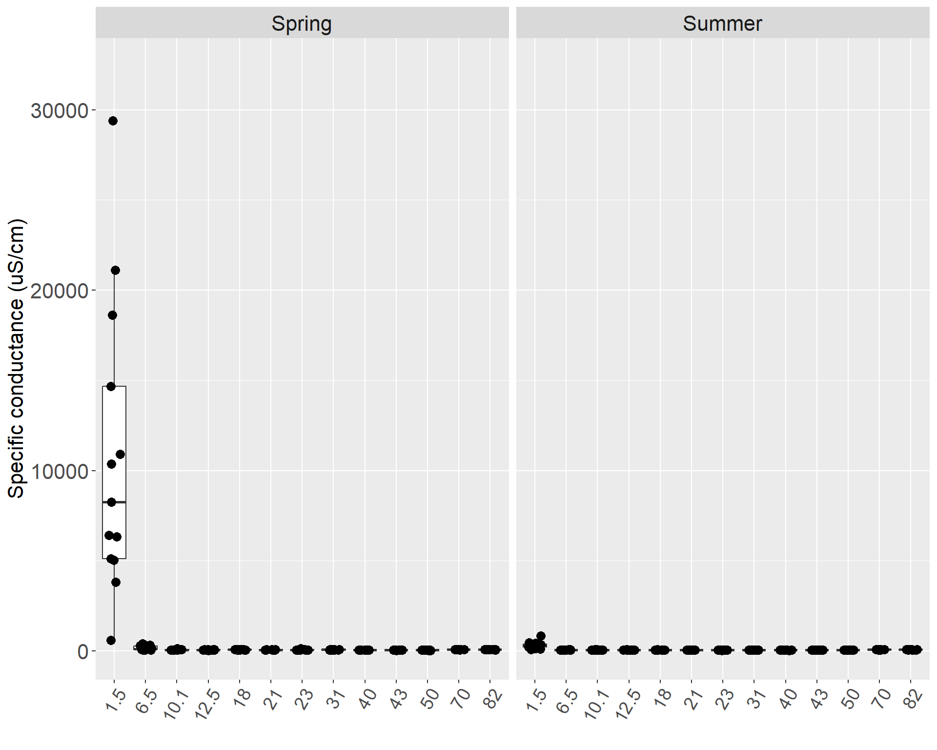 The highest level of specific conductance in the mainstem was 29398 µS/cm, which was sampled at Mile 1.5 in spring 2011, and the lowest level was 37.7 µS/cm at Mile 50 in spring 2004 (Table X). Mile 1.5 had the greatest variance and the highest median in both the spring and the summer, followed by Mile 6.5 in the spring and Mile 70 in the summer. From Mile 10.1 to Mile 50, the specific conductivity medians only varied within a span of 15 µS/cm in both spring and summer, with the lowest median at Mile 43. Above Skilak Lake at Mile 70 and Mile 80, specific conductivity was higher relative to the rest of the mainstem, excluding the estuary. Specific conductivity was higher in the spring than in the summer throughout the mainstem, except at Mile 50 where specific conductance was higher during the summer (Figures X & X).
