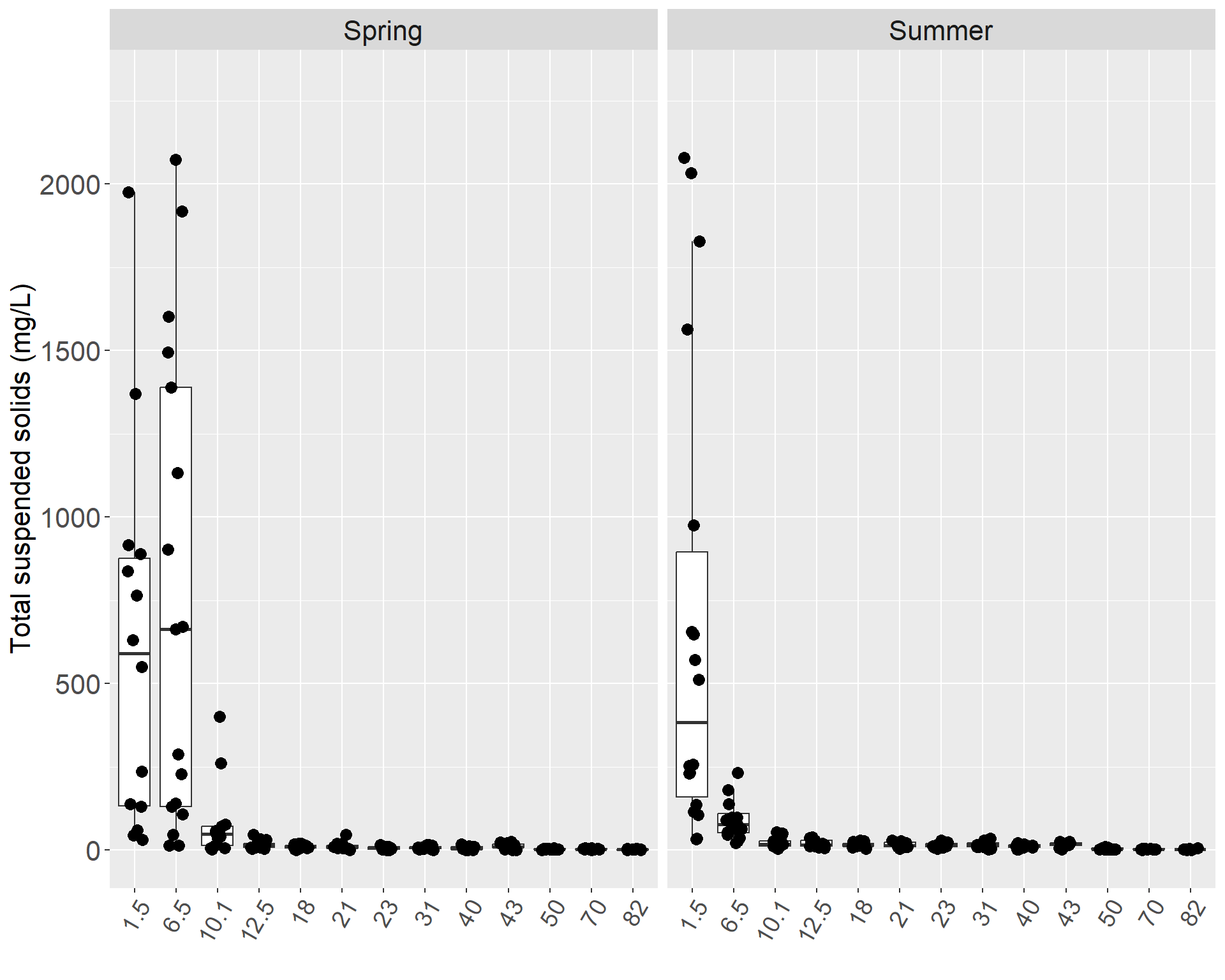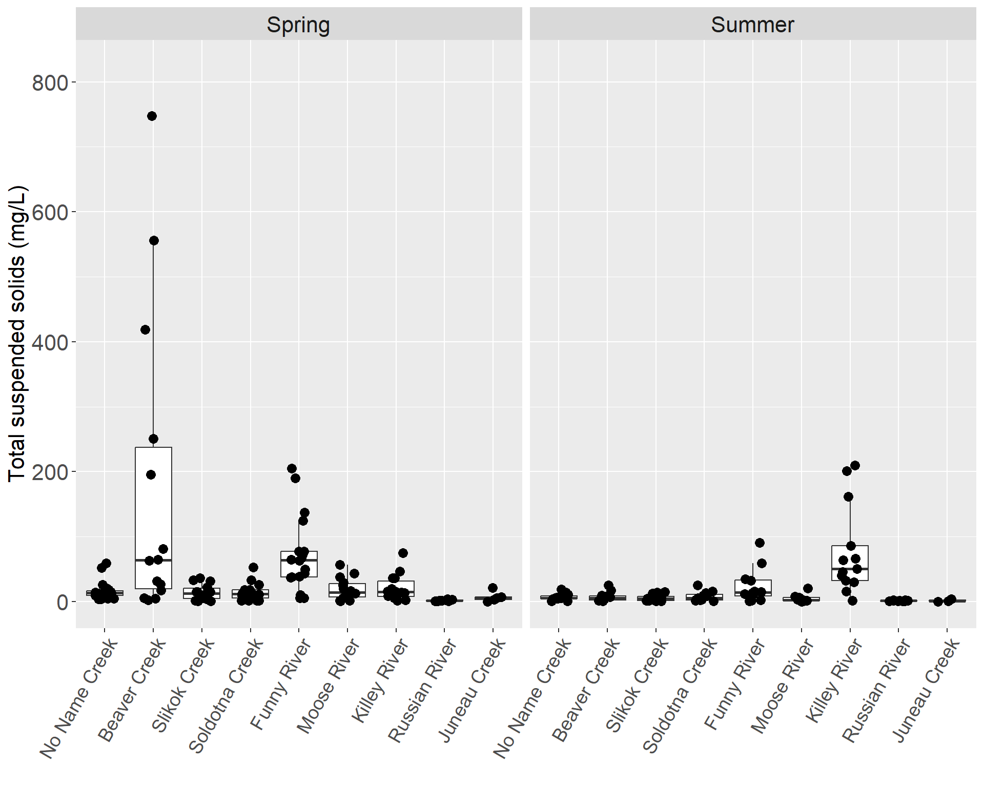 In the tributaries, the concentration of total suspended solids ranged from a high of 748 mg/L in Beaver Creek in spring 2009 to a low of less than the MDL of 0.48 mg/L (Table X). The Killey River had the highest median and largest variance by far in the summer. Funny River also had a relatively large degree of variance, but had a similar median to the other tributaries, excluding the Killey River in the summer. During the spring, Beaver Creek had the highest median and a relatively large degree of variance. Russian River had the lowest median of total suspended solids in the spring and Juneau Creek in the summer. Excluding Russian River and Killey River, the tributaries had higher medians during the spring rather than the summer. (Figures X)