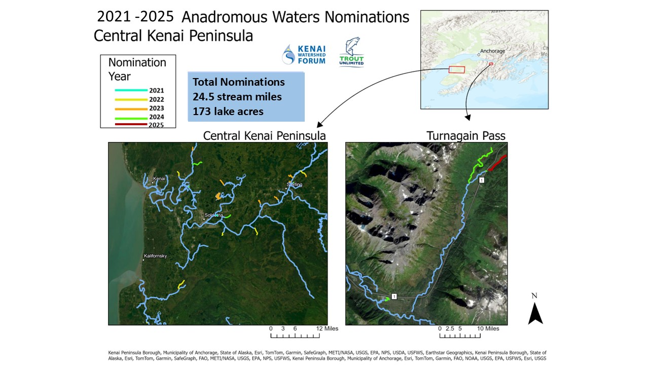 Fish capture data was evaluated against the 2025 Anadromous Waters Catalog to identify new stream segment nominations. Complete submission materials for 2021 - 2023 may be accessed in the project Google Drive folder (link), sent to the ADF&G Habitat Division in Anchorage in the fall of each year. In 2024 we submitted all nominations through the Fish Map App smartphone application from the Alaska Conservation Foundation